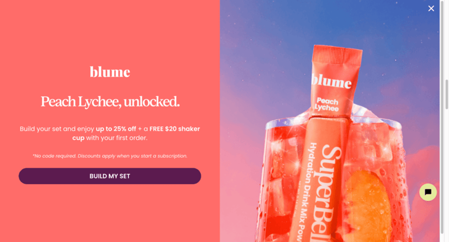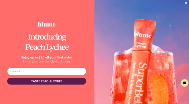 Blume's beautifully designed email pop-up leverages an exciting new product launch to grow their mailing list.