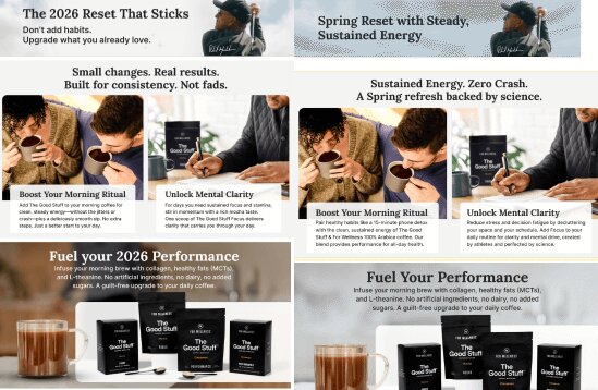 One creates hesitation. The other removes it. The benefit pillars stay identical (mental clarity, morning ritual, performance fuel), but the language becomes lighter.