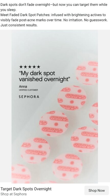 The Faded Dark Spot Patches launch had everything going for it: a breakout product line and Sephora shelf presence. But there’s still specific creative opportunities to help unlock new audiences at a lower CAC.