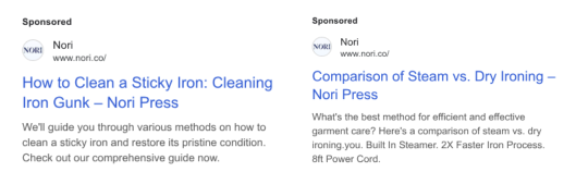 In some instances, ad copy for core product searches leads with accessory messaging, such as the travel case. When a user searches for the Nori Press and lands on an accessory page, that disconnect creates an immediate drop-off.
