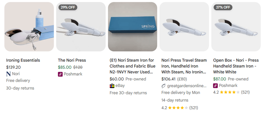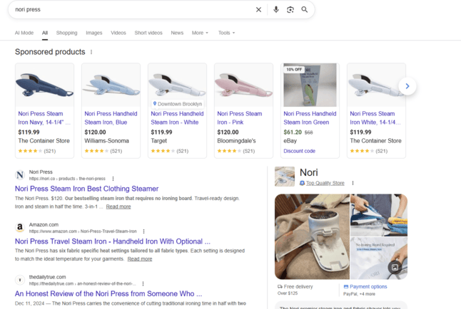 On branded searches like “nori press,” the product appears consistently with strong presentation: clean imagery, reviews, and pricing.