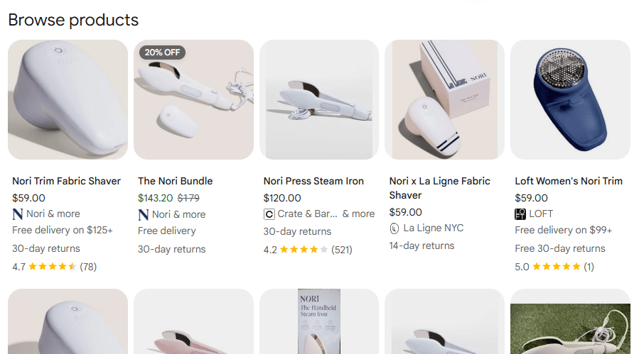 Meanwhile, competitors (including legacy brands and marketplaces) are consistently present across these product-driven queries. In many cases, Nori is either absent or buried.