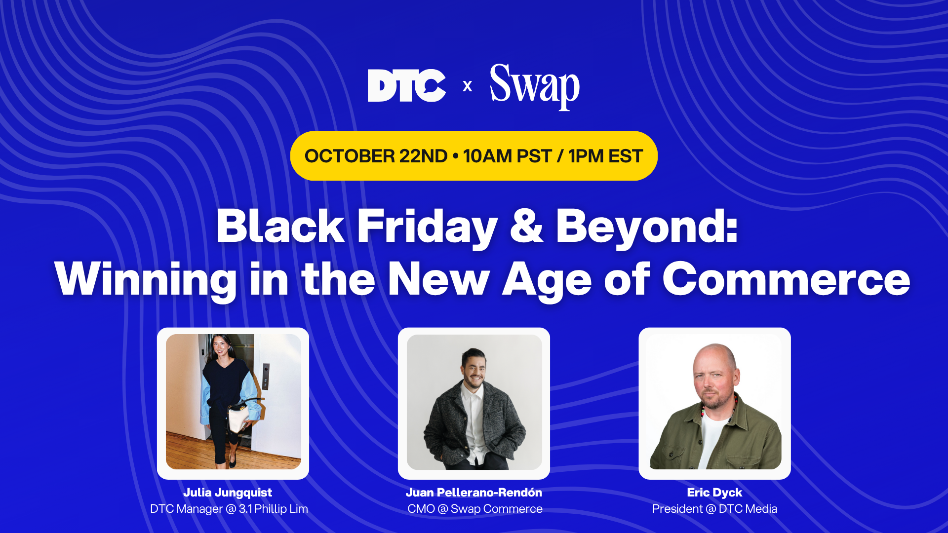 Tomorrow (Wednesday, October 22 at 10AM PST / 1PM EST), DTC, Swap Commerce, and 3.1 Phillip Lim are coming together for a live roundtable on how top brands are surviving (and thriving) through BFCM and beyond.