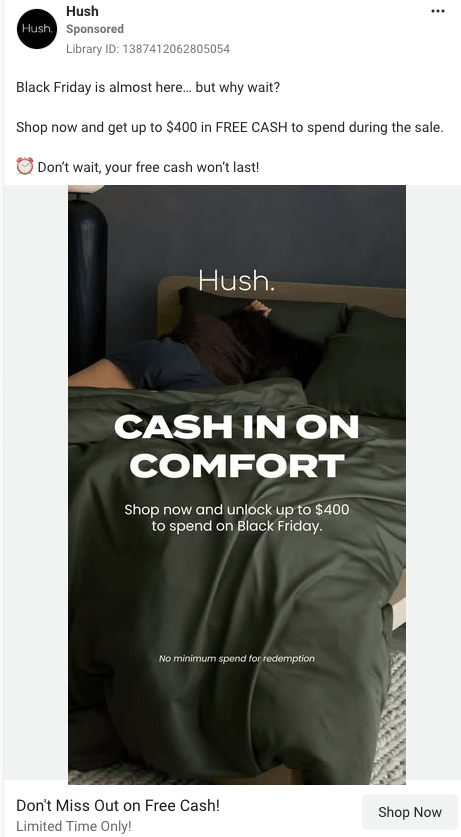 Hush’s Black Friday offer asks customers to earn Hush Cash now so they can spend it on Black Friday.