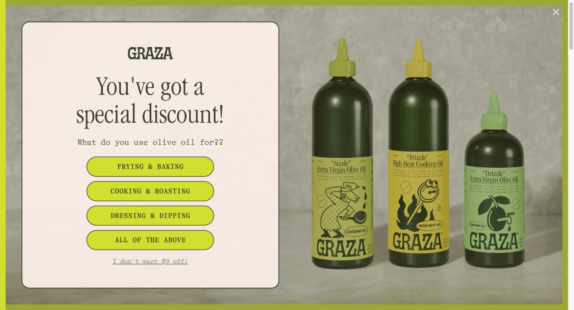 ✅ Product education baked in: The options (“Frying & Baking,” “Cooking & Roasting,” etc.) double as use cases for their oils, teaching new customers about Graza’s versatile product assortment.