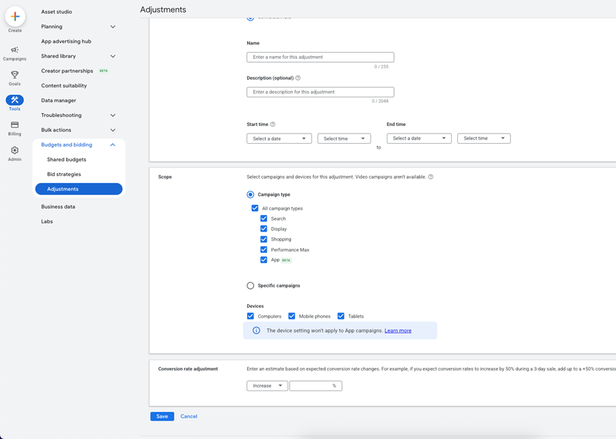 In Google Ads, go to Tools â Budgets and Bidding â Adjustments, then select the Seasonal tab and click the plus button to create a new adjustment.