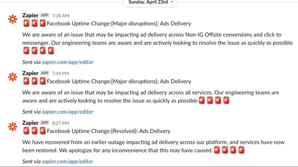 3️⃣ Zapier Alerts: The Pilothouse team utilizes Zapier alerts that feed into their Slack workspace for media buyers. The alerts sound when Meta posts a disruption notification.